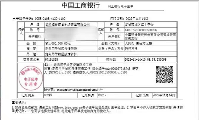 11月14日,晋能控股装备制造集团通过城区红十字会向晋城市城区捐赠现金100万元,用于支持城区疫情防控工作。