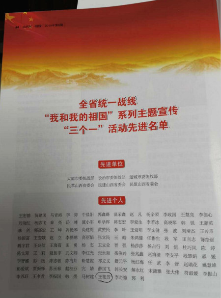 日前,由中共山西省委统战部主办的期刊《山西统一战线》第6期通报了《全省统一战线“我和我的祖国”系列主题宣传“三个一”活动先进名单》,王艳芳同志因其征文《共和国十月的天空》荣获“先进个人”称号,民盟晋城市委会梁丽萍主委代表晋城广大盟员对王艳芳同志获得的荣誉表示祝贺!