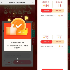 为深入学习宣传贯彻党的二十大精神,进一步激发爱党爱国爱社会主义的热情,营造团结奋斗、自信自强、国泰民安的浓厚社会氛围,二十大期间,我中心各科室积极参与由中共晋城市委宣传部在全市广泛开展的“强国复兴有我 奋斗成就梦想”云上有奖知识竞赛活动。