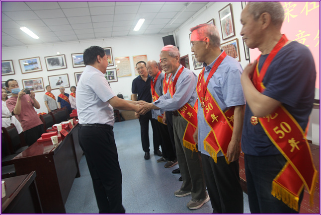 今年,党中央首次决定在全党颁发“光荣在党50年”纪念章,对进一步增强党员的荣誉感、归属感、使命感,具有十分重要的意义。李炎同志强调,广大老党员老干部历经沧桑而初心不改、饱经风霜而本色依旧,他们是忠诚爱党的践行者,是建市兴市的参与者,是新风正气的引领者。希望广大老同志继续弘扬共产党人的优良品质,坚持离岗不离党、退休不褪色,充分发挥政治优势、经验优势、威望优势,继续为晋城高质量发展献计献策、发光发热。他要求,在职党员干部要以老党员为榜样,学习他们在党爱党、在党言党、在党忧党、在党为党的优秀品质,大力弘扬红色传统、传承红色基因、赓续红色血脉,在推动我市高质量转型发展中作出更大贡献。