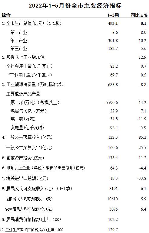 2022年1-5月份全市主要经济指标