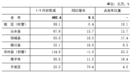 1-9月份,全市固定资产投资完成492.4亿元,同比增长9.5%,增速排全省第三位,高于全国平均水平3.6个百分点,高于全省平均水平3.2个百分点。