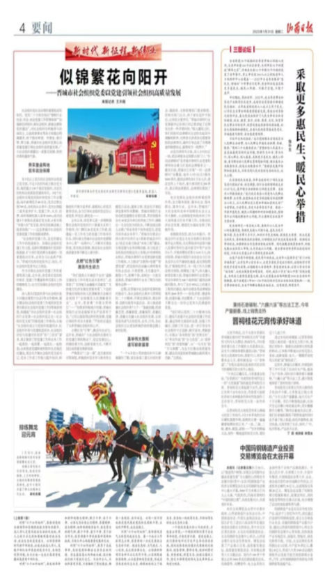 2023年1月31日,《山西日报》刊登了题为《似锦繁花向阳开——晋城市社会组织党委以党建引领社会组织高质量发展》的专题报道,展现了我市社会组织党委党建引领社会组织蓬勃发展的风貌。