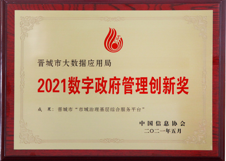 5月25日,2021数字政府高峰论坛在贵阳召开,会上发布了2021数字政府创新成果与优秀案例名单,晋城市大数据应用局提报的“市域治理基层综合服务平台”荣获“2021数字政府管理创新奖”。