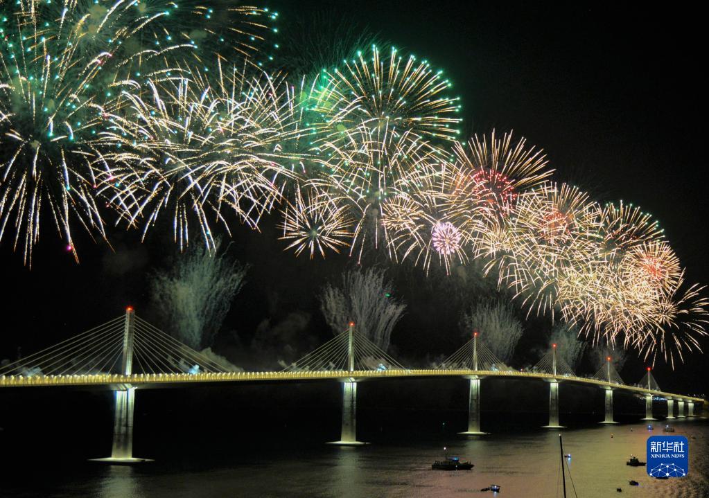 这是在克罗地亚科马尔纳拍摄的由中企承建的佩列沙茨大桥通车仪式上的焰火表演(2022年7月26日摄)。新华社记者 李学军 摄