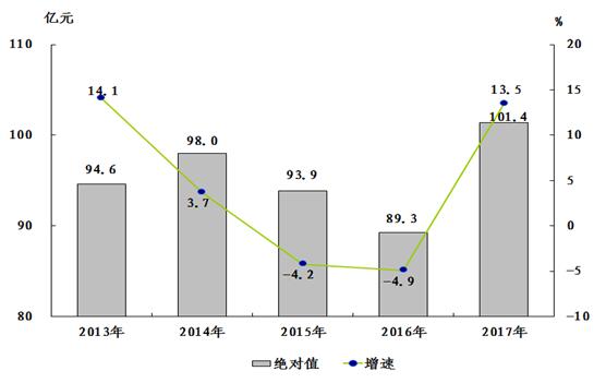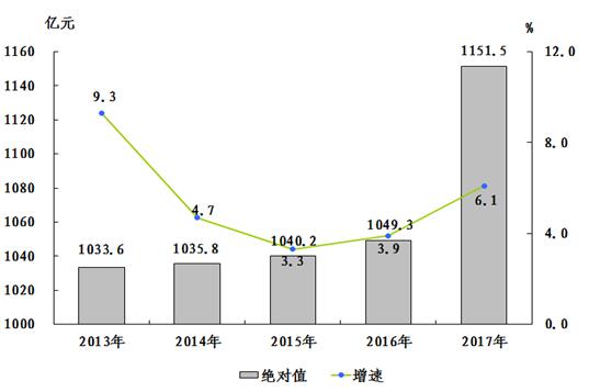 初步核算,全年全市生产总值1151.5亿元,按可比价格计算,比上年增长6.1%。其中,第一产业增加值50.7亿元,增长1.3%,占生产总值的比重为4.4%;第二产业增加值618.9亿元,增长5.1%,占生产总值的比重为53.7%;第三产业增加值481.9亿元,增长8.0%,占生产总值的比重为41.9%。第三产业中,金融保险业增加值75.2亿元,增长8.0%;交通运输、仓储和邮政业增加值85.4亿元,增长12.0%;批发和零售业增加值65.0亿元,增长3.0%;住宿和餐饮业增加值32.9亿元,增长6.4%;营利性服务业增加值50.0亿元,增长9.6%。人均地区生产总值49487元,按2017年平均汇率计算为7326美元。