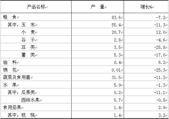 全年粮食产量83.6万吨,减少6.4万吨,下降7.2%。其中,夏粮20.7万吨,增长12.0%;秋粮62.9万吨,下降12.1%。