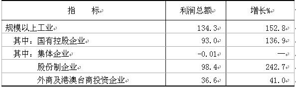 规模以上工业实现利税260.0亿元,增长94.8%;实现利润134.3亿元,增长152.8%。