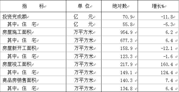 全年房地产开发投资70.9亿元,下降11.8%。其中,住宅投资55.8亿元,下降5.3%;商业营业用房投资8.5亿元,下降22.9%。