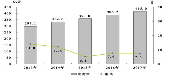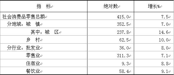 全年全市社会消费品零售总额415.0亿元,增长7.5%。按经营地统计,城镇消费品零售额352.5亿元,增长7.0%;乡村消费品零售额62.5亿元,增长10.0%。