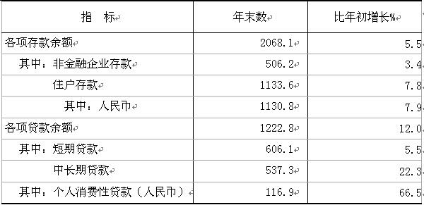 年末全市金融机构本外币各项存款余额2068.1亿元,比年初增加106.9亿元,增长5.5%。各项贷款余额1222.8亿元,比年初增加131.0亿元,增长12.0%。