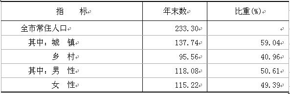 据2017年人口抽样调查,年末全市常住人口为233.30万人,比上年末增加1.22万人。全年全市出生人口2.39万人,人口出生率为10.26‰;死亡人口1.17万人,死亡率为5.03‰;自然增长率为5.23‰。出生人口性别比为102.33(以女性人口为100)。